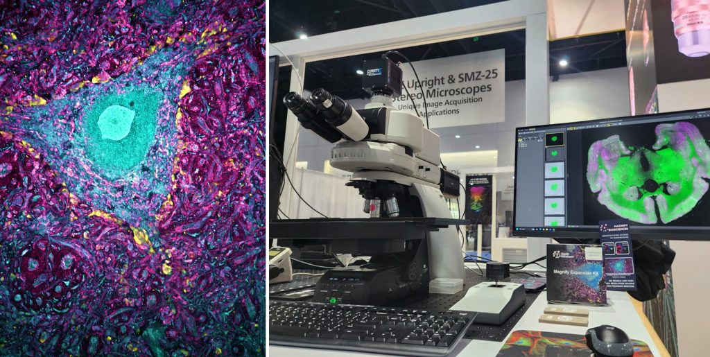 - Demonstrations: Attendees saw firsthand how our Magnify kits/slides integrate seamlessly with Nikon’s industry-leading imaging systems. (Note: The image displayed in the computer screen in the photo was from an non-ExM sample and shown in an inverted orientation relative to standard anatomical conventions.)